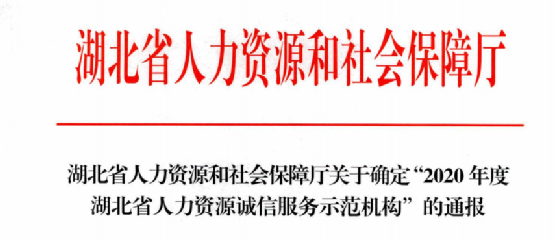 近日,湖北省人力资源和社会保障厅发布了关于《2020年度“湖北省人力资源服务诚信示范机构”的通报》,中智华中人力资源管理有限公司与中智湖北经济技术合作有限公司成功入选 ,荣获“2020年度湖北省人力资源服务诚信示范机构”的称号。